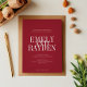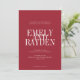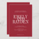 Die Einladung zur Hochzeit zeichnet sich durch ein minimalistisches Design mit rubinrotem Hintergrund und einem sauberen, symmetrischen Layout aus. Es verwendet elegante Serif-Schriftart, wobei die Namen des Ehepaares in einem großen, überlappenden Text für eine kühne und moderne Touch hervorgehoben dargestellt werden. Die übrigen Details sind in einem kleineren, klaren Schriftart angeordnet, wobei die Einfachheit und Eleganz gewahrt bleiben und zeitgenössische und traditionelle Ästhetik kombiniert werden.