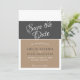 Moderne, einfache Script Save the Date Card. Diese Save the Date Karte ist in Schwarz, Weiß und Braun gehalten. Der Text ist ein trendiges Skript. Sie können den gesamten Text auf der Karte leicht anpassen - personalisieren Sie ihn mit dem Namen der Braut, dem Namen des Bräutigams, dem Hochzeitstag und dem Ort der Hochzeit, und ändern oder löschen Sie jeden Text auf der Einladung.
