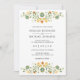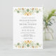 Künstlerische Hochzeitseinladungen mit gelben, orangefarbenen und aquamarinen Blume, Weinreben und Blätter auf weißem Hintergrund. Ihre Daten sind in der Mitte der beiden Grenzen, in einer serifenlosen Sans. Die Rückseite ist grün und kann in eine beliebige Farbe geändert werden. Dieses Design ist ideal für eine Gartenhochzeit im Sommer.