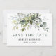 Die moderne Elegant Watercolor Botanische Verlobung Hochzeitskarte Save the Date beinhaltet Eukalyptus-Blätter, grünes botanisches Blattwerk, staubblaue Blätter und andere schöne botanische Pflanzen. Legen Sie die Farbe grün zurück.