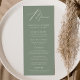 Einfaches und elegantes Hochzeitsmenü mit "Menü", das in einem modernen weißen Skript mit einem sage grünen Hintergrund oder Farbe Ihrer Wahl angezeigt wird. Personalisieren Sie das Salbei-grüne Hochzeitsmenü, indem Sie Ihre Namen, das Hochzeitdatum und Menüinformationen hinzufügen. Entworfen, um mit unserer Hochzeitskollektion "Moderne Elegance" zu koordinieren.