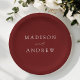 Die eleganten, personalisierten bordeauxfarbenen Hochzeitszettel-Teller sind perfekt für Ihre Hochzeitsfeier, Probe Dinner, Verlobungsfeier und vieles mehr! Die bordeauxfarbenen Teller sind ideal für Hochzeiten im Sommer, Herbst, Winter und Frühjahr. Das Design ist mit einem schicken, modernen Kalligraphieskript ausgestattet, das auf bordeauxrotem Hintergrund Ihre Namen in weißer Schrift trägt. Das Design koordiniert mit unserer Hochzeitskollektion "Modern Elegance Burgundy".