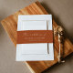 Elegante Hochzeitseinladung Bauchbands mit "der Hochzeit von" in einem weißen Kalligraphieskript auf Terrakotta Hintergrund dargestellt. Personalisieren Sie die modernen Hochzeitsbauch Bands mit Ihren Namen und Hochzeitsdatum unten in weißer Schrift.