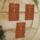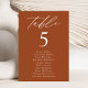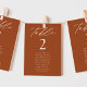 Elegantes Hochzeitssitzdiagramm mit "Tisch" in weißem Kalligrafieschrift mit der unten abgebildeten Tischnummer und den Gästennamen auf Terrakotta-Hintergrund. Das Design wiederholt sich auf der Rückseite. Um das Sitzdiagramm der Tischnummer zu bestellen, editieren Sie jede Karte mit der Tischnummer und den Namen der Gäste und fügen Sie es Ihrem Warenkorb hinzu. Entworfen, um mit unserer Hochzeitskollektion "Moderne Elegance" zu koordinieren.