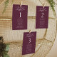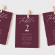 Elegante Hochzeitssitzkarte mit "Tisch" in weißem Kalligrafieschrift mit der unten abgebildeten Tischnummer und den Namen der Gäste auf einem Weinhintergrund. Das Design wiederholt sich auf der Rückseite. Um das Sitzdiagramm der Tischnummer zu bestellen, editieren Sie jede Karte mit der Tischnummer und den Namen der Gäste und fügen Sie es Ihrem Warenkorb hinzu. Entworfen, um mit unserer Hochzeitskollektion "Moderne Elegance" zu koordinieren.