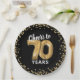 Elegante siebzigste Geburtstagsfeier-Teller mit einem stilvollen schwarzen Hintergrund, der in jede Farbe geändert werden kann, Gold funkelnd Glitzer, und das Sprichwort "jubelt bis 70 Jahre" mit siebzig goldenen Helliumballons.