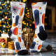 Genießen Sie die modernen festlichen Socken, die eine spielerische Mischung aus abstraktem Blau und Orange mit strahlenden Sonnenburstdesigns auf weißem Hintergrund anbieten. Ideal für Weihnachten, saisonale Veranstaltungen oder als stilvolles Geschenk, verleihen diese Socken jedem Urlaubsschrank eine lebendige Eleganz.