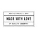 Stilvoll Made with Liebe Rubber Briefmarke mit Ihrem Namen und Ihrer Website-Adresse in fetten Schriftart zwischen aufgeteilten Rechteck Rand. Personalisieren Sie es, indem Sie den Platzhalter-Text durch Ihren Namen und Ihre Adresse ersetzen. Für weitere Optionen, wie zum Beispiel den Schriftart zu ändern, ist es die Größe, Abstand zwischen Buchstaben oder Zeilenabstand klicken Sie auf die Schaltfläche "Anpassen". *Bitte beachten Sie, dass das Zazzle-Wasserzeichen, das in der Zoomvorschau angezeigt wird, NICHT auf dem gedruckten Endprodukt erscheint. © Rosewood and Citrus