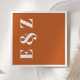 Diese einfachen, modernen Hochzeitsnapkins sind mit den Initialen des Ehepaares in fett weißer Typografie versehen, die senkrecht am links Rand auf einem verbrannten orangen Hintergrund angeordnet sind.