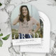 Eine moderne, minimale und klassische Schwarz-Weiß-Thema Graduation Party Ankündigung Einladung mit einem Foto auf der Vorder-und Rückseite der Karte. Ein stilvoller Serif-Schriftart mit dem Wort "Grad" auf der Vorderseite. Passen Sie Ihre Fotos an und fügen Sie Ihre Informationen hinzu, um eine elegante Einladung zu schaffen.