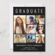 Moderne schwarze Abschluss-Ankündigung und Party Einladung mit "GRADUATE" in großen weißen Buchstaben, eine 7-Foto-Collage des Absolventen und ihren Namen, Jahrgang und Schule in schlicht weißer Typografie. Fügen Sie auf der Rückseite die Details zum Party hinzu.
