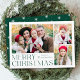 Einfache und elegante Urlaubskarte mit einer 3-Foto-Collage auf der Vorderseite mit "Frohe Weihnachten" in grün-moderner Schrift. Personalisieren Sie die Kartenvorderseite, indem Sie Ihre Fotos und Ihren Namen hinzufügen. Die Karte kehrt um, um das vierte Foto mit einem weißen Schneeflockenmuster anzuzeigen. Die Multi-Foto-Ferienkarte ist ideal, um alle Ihre Lieblings-Fotos anzuzeigen!