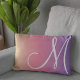 Dieses moderne Lumbalkissen zeichnet sich durch ein minimalistisches Design aus, mit einem weißen, übergroßen Monogramm auf einem farbenfrohen gelben, rosa und lila Farbverlauf.