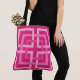 Gedruckte Tasche in einem Retro-modernen Muster ineinander greifender Quadrate, in Pastelltönen bis heiß rosa, auf tiefem fuchsienrosa Hintergrund