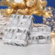 Moderne geometrische, fröhliche Typografie mit vielen Fotos Weihnachtsgeschenkverpackung, minimale monochrome Schwarz-Silber-Effekt Grafik Design. Teil einer Ferienkollektion.