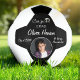 Modern Herzlichen Glückwunsch Grad Abschluss Foto Soccer. Personalisierter Fußball mit Graduierungskappe, Sondertext und Foto in einem runden Rahmen auf schwarzem Hintergrund. Eine tolle Geschenkidee für einen Absolventen, der sportlich Lieben hat.