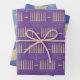 Modernes Hanukkah-Umhüllungspapier mit farbenfrohen Farbtönen lila Papiers mit modernen Goldmenorahs auf einer, tanzende Golddreidel auf einer anderen und goldene Tauben, die einen Olivenzweig tragen; die gleiche Taube, die in Noahs Bogen zurückkehrte, der den Olivenzweig mit trockenem Land, Frieden mit Gott, Unschuld und Reinheit trug.