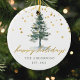 Weihnachtsbaumschmuck nach Maß mit "fröhlichen Feiertagen", Weihnachtsbaum und goldenem Glitzer. Personalisieren Sie mit Familienname und Jahr.