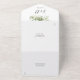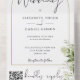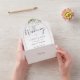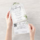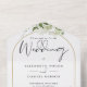 Alles in einer Hochzeitseinladung mit botanisch grünen rustikalen Blätter, die über einen goldenen Bogen mit eleganter Typografie fallen. Die Einladung enthält eine perforierte RSVP-Karte mit Ihrem Hochzeitswebseiten QR Code und Details. Entwickelt von Thisisnotme©
