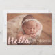 Herzlich willkommen bei Ihrem kleinen Kind mit diesem süsslichen und einfachen Geburt-Ankündigungsdesign mit dem horizontalen Foto Ihres Babys mit "Hello" in einer sanften, rot-rosa handgeschriebenen Schrift. Passen Sie den Namen Ihres Babys, das Geburtsdatum und die Statistiken auf der Vorderseite an, während die Rückseite eine Collage von sechs quadratischen Fotos mit Platz unten für die Familiennamen oder eine kurze Nachricht zeigt. Dieses charmante Design ist perfekt für kleine Mädchen geeignet und verleiht Ihrer großen Ankündigung eine warme, zarte Touch.