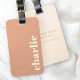 Modernes, minimales Gepäckanhänger mit individuelle Name oder Text, senkrecht nach rechts ausgerichtet auf einem hellterracotta braunen Hintergrund.