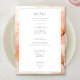 Stellen Sie sich ein Hochzeitsmenü vor, das sich wie ein Spaziergang in einen schönen Garten mit weichen, weichen Pfirsichfarben anfühlt. Dieses pfirsichfarbene Hintergrundmenü vereint sanfte Pastelltöne und atemberaubende Blume auf moderne und elegante Weise.