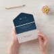 Elegant alles in einer Hochzeitseinladung mit Ihren Monogramm-Initialen und Hochzeitsdetails in weißem Text mit modernen Kalligraphie-Schriftzeichen Akzenten mit marinischem Hintergrund. Das Design enthält eine abnehmbare RSVP-Karte unten, die als Postkarte an Sie zurückgeschickt werden kann. Entworfen, um mit unserer Hochzeitskollektion "Moderne Elegance" zu koordinieren.