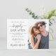 Moderne Hochzeiten speichern die Datumsanzeige mit Ihrem Foto und "Happily Ever After" in einer Mischung aus einfacher Typografie und einem stilvollen Drehbuch mit Swashes. Personalisieren Sie Ihre Save the Date Angaben und fügen Sie Ihre Namen in ein signaturähnliches Skript ein. Auf der Rückseite, Ihre Namen und Hochzeitstag werden durch ein Herz verbunden.