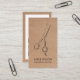 Elegante, vollständig anpassbare Visitenkartenvorlage mit DRUCKTEM KRAFTPAPIERhintergrund, schwarzer Schere. Modernes, elegantes Design für Haarstudio, Friseur.