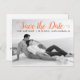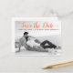 Moderne Korallenskripte Hochzeit Save the Date Foto Postcard. Dieses zeitgenössische Typografie Save the Date Design zeichnet sich durch ein Schwarz-Weiß-Foto des Ehepaares und den Text "Save the Date" in einem modernen Script-Schriftart aus.
