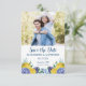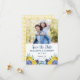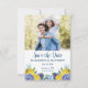 Diese moderne Zitronenhochzeit bewahrt die Dattelinie für eine Hochzeit im Frühling oder Sommer. Dieses elegante Design besticht durch helle und schöne Aquarellfarben mit eleganten blauen Blumen und Grünpflanzen. Ein gelbes und weißes Muster schmückt die Rückseite der Einladung. Entworfen für Sie von BlackBerry Boulevard.