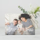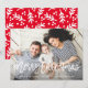 Dieses saisonale Foto-Kartendesign zeichnet sich durch ein volles Bleichbild mit einem Schriftart-Overlay aus gebürstetem Blatt und ein lustiges Rot-Weiß-Beerenmuster auf der Rückseite aus.
