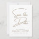 Auf dieser Save the Date-Karte wird ein elegantes minimalistisches Design vorgestellt. Die weiße Karte hat Save the Date eine goldene Handschrift. Personalisieren Sie mit Ihren Namen, Hochzeitsdatum und Ort in einem einfachen goldenen Schriftart.
