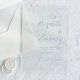 Diese einfache, moderne Hochzeitseinladung enthält dustig blauen Text auf einem klaren Hintergrund. Fügen Sie die Namen der Braut und Bräutigam in stilvoller Handschrift Kalligraphie und die Details in sans serif Schriftart.