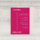 Moderne und minimalistische beschreiben diese auffällige Hochzeit. Fette Namen in blassrosa mit einer dünnen, senkrechten, blassrosa Linie und einem einfachen serifenlosen Sans-Schriftart auf magentafarbenem Hintergrund machen Ihre Hochzeitseinladungen zu einem Sofortklassiker. Das Hotel ist das perfekte Design für eine einfache, elegante Hochzeit in der Stadt oder für eine moderne, intime Hochzeit.