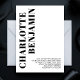 Diese kühn, modern und mühelos minimalistisch gestaltete Hochzeitseinladung zeigt auf einem knackigen weißen Hintergrund die schwarze Typografie. Das Design ist perfekt für zeitgenössische Paare geeignet und zeichnet sich durch saubere Linien und eine vertikale Anordnung aus, die eine zeitlose und raffinierte Ästhetik bietet. Ideal für stilvolle Hochzeiten und Sets für ein elegantes Fest. Moderne und raffinierte Eleganz.