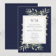 Diese schicke botanische Hochzeitseinladung kann mit Ihren Monogramm-Initialen und besonderen Informationen zum Hochzeitstag personalisiert werden. Sie verfügt über zarte Blätter in Aquarellgrün auf marinebasischem Hintergrund. Entwickelt von Thisisnotme©