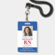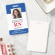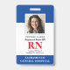 Modernes Foto ID RN Registered Nurse Abzeichen. Design mit medizinisch blauem und weißem Hintergrund, Single Foto, Krankenhausname, Beruf und Name. Personalisieren Sie Ihren Bar Code und Ihre Kontaktdaten. Moderne ID-Abzeichen machen es Kunden und Kunden einfach, Mitarbeiter zu identifizieren. Um diese Vorlage zu bearbeiten, klicken Sie auf Weitere Einstellungen.