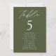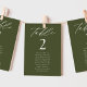 Elegante Hochzeitssitzkarte mit "Tisch" in weißem Kalligrafieschrift mit der unten abgebildeten Tischnummer und den Gästennamen auf einem olivgrünem Hintergrund. Das Design wiederholt sich auf der Rückseite. Um das Sitzdiagramm der Tischnummer zu bestellen, editieren Sie jede Karte mit der Tischnummer und den Namen der Gäste und fügen Sie es Ihrem Warenkorb hinzu. Entworfen, um mit unserer Hochzeitskollektion "Moderne Elegance" zu koordinieren.