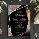 Eine moderne Hochzeitseinladung mit einem eleganten geometrischen Rahmen in schimmernder Goldfolie aus Rose. Das Hauptfarbenthema ist schwarz mit Opal- und Imitat-Glitzer-Akzenten. Rose Goldfolie schmückt die Hauptdetails und den geometrischen Rahmen mit der Erholung des Textes weiß. Calligraphie-Skript fügt eine Touch von Glamour und Luxus hinzu.