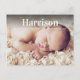 Teilen Sie einfach Ihre glücklichen Nachrichten mit dieser kühnen Geburtsankündigung Postkarte. Auf der Vorderseite der Postkarte befindet sich ein großes Foto Ihres Neugeborenen. Ein weißes Texteüberlagerungsstück an der Spitze des Designs enthält den fett geschriebenen Namen Ihres neuen Babys. Unten können Sie den vollständigen Namen und das Geburtsdatum Ihres Babys hinzufügen. Dieses Design funktioniert am besten mit Fotos, die einen dunkleren Hintergrund haben, sodass der weiße Text wirklich leuchten kann. Auf der Rückseite der Postkarte finden Sie Platz, um eine längere benutzerdefinierte Nachricht an Empfänger zu schreiben.