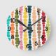 Diese Wanduhr hat ein modernes Design von vertikalen Linien mit abgerundeten Rechtecken in zunehmender und abnehmender Größe in Retrofarben rot, grün, blau, gelb, orange und braun auf einem Feld von weiß.