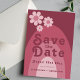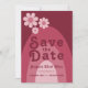 Kühne moderne Groovy Retro 70er burgundy rosa und magenta Hochzeit speichern Sie die Dattelkarte. Cooles Retro-minimalistisches Muster mit Regenbogenbogen-Design in Rosa und Bordeaux. Diese lustige Hippy-Save the Date-Karte lässt sich einfach mit den einfachen Vorlagen personalisieren. Ideal, um den Ton für eine Sommerfrühlings- oder Herbsthochzeit zu setzen. Original-Kunstwerk von Catherine Sweetman