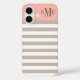 Dress up and protect your iphone with a simple, modern and stylish striped pattern design that is custom mit Monogramm with your first, mittel and last name initials in a preppy serif Schriftart. Neutrale, beige / taupe und weiße horizontale Streifen kontrastiert mit einem hellrot rosa / pfirsichfarben Block Hintergrund. Dunkel warmer grauer Text.