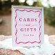 Fügen Sie Ihrer Hochzeit, Ihrem Brautparty, Ihrer Babydusche, Ihrer Abschlussfeier oder einem anderen besonderen Event eine stilvolle Touch mit diesem Modern Pink Wavy Frame Karten und Geschenkzeichen hinzu. Das Design zeigt "Karten und Geschenke" in fett rosa Schrift, umgeben von einem rosa, gewellten Rahmen kontrastiert mit einem hellrosa Hintergrund. Personalisieren Sie die Retro-Karten und Geschenke-Zeichen mit Ihrem benutzerdefinierten Text unten. Wählen Sie zwischen beruflichem Druck oder Sofortdownloads, um Flexibilität zu bieten.