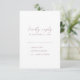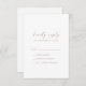 Diese moderne Rose Gold Script einfache RSVP Karte ist perfekt für eine minimalistische Hochzeit. Das schlichte rosa Rosa Rosengold-Design zeichnet sich durch eine einzigartige industrielle Schrift mit modernem Boho-Stil aus. Anpassbar in jeder Farbe. Behalt das Design minimal und elegant, wie es ist, oder personalisiere es durch Hinzufügen von eigenen Grafiken und Kunstwerken.