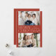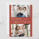 Moderne Weihnachtskarte mit "Frohe Weihnachten", die im Zentrum des Designs in trendiger weißer Schrift mit Rosthintergrund ausgestellt ist. Personalisieren Sie die einfache Weihnachtskarte mit Ihrem Familiennamen und 2 horizontalen Fotos. Die Karte kehrt um, um einen Rosthintergrund mit subtilen weißen Punkten (Schnee) anzuzeigen.