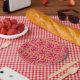 Farbenfrohe Herzen in verschiedenen Größen geformt, macht es zu einem schönen modernen Muster auf einem orangefarbenen Hintergrund.