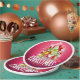 Papier Teller mit einem hellen und festlichen Weihnachtsgrafik-Design. Der Text sagt frohe Weihnachten und Glück im neuen Jahr. Entworfen mit einem baumförmigen Hügel mit festlichen Schneeflocken, Sternen, Weihnachtsbaumbläsern und glänzend aussehenden Glitzern. Der Hintergrund ist eine lebendige rötlich-rosa Farbe.