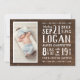 Erschwingliche, individuell bedruckte Fotokarten für die Geburtshilfe. Dieses moderne rustikale Design besticht durch eine trendige Typografie, die personalisiert mit den Geburtsdaten des Kindes und dem neugeborenen Foto auf einem Holzhintergrund aus Imitaten ist. Fügen Sie bei Bedarf weitere Fotos und zusätzlichen Text auf der Rückseite hinzu. Verwenden Sie die Designtools, um die Schriftart und Farben zu bearbeiten, mehr Fotos hinzuzufügen und eine einzigartige Kindergeburtsankung für Ihren neuen Babyjungen zu erstellen.